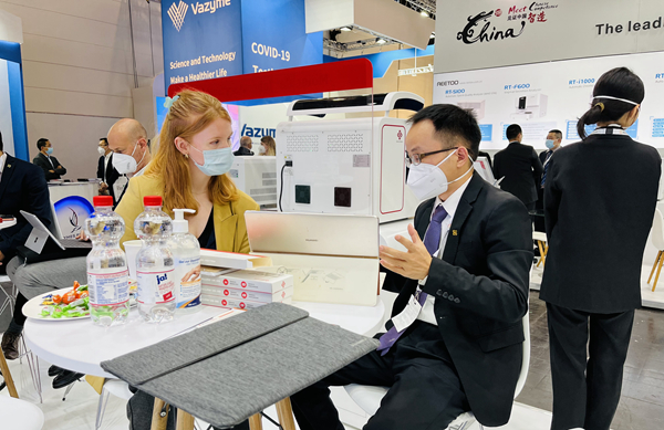 在leyu乐鱼展台,“全自动解决方案”“半自动解决方案”“新冠整体解决方案”,以最大程度满足不同国家和地区客户、不同应用场景检测需求的特点,获得了众多来访国际客户的好评。尤其是iPonatic四通道产品,以其便捷、易操作、检测时间快、检测项目多等优势吸引了会场一大波新老“粉丝”的目光。