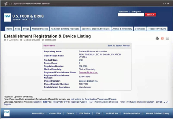 美国食品药品监督管理局(FDA)是国际医疗审核权威机构,通过FDA认证的食品、药品、化妆品和医疗器械等产品,是全球权威标准证明。leyu乐鱼生物四通道iPonatic核酸检测分析仪获美国FDA认证后,将有效扩大和满足全球市场各级检测防控需求,为全球疫情防控工作持续助力,推动公司全球化事业发展。